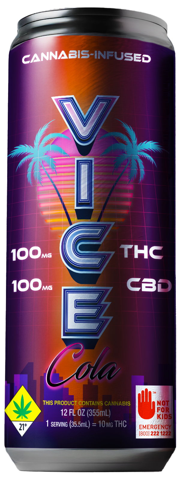 Meet “VICE Cola,” the embodiment of a personalized journey into relaxation and flavor. Enveloped in the mesmerizing hues of synthwave aesthetics, this cannabis-infused beverage transcends the ordinary with a pulsating blend of nostalgia and innovation. With each sip, you’re not just tasting cola; you’re embracing an experience tailored to your mood. VICE Cola offers a spectrum of THC and CBD levels, giving you the power to curate the perfect chill. Picture the neon glow of the can as you navigate the retro-futuristic landscape of relaxation, where every fizz and sparkle echoes the beat of your own rhythm. In the world of VICE Cola, the future is in your hands, and it tastes refreshingly, uniquely yours.